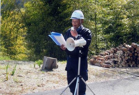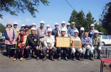 | 【活動内容】 絶好のボランティア日和に恵まれた中で、午前9時30分から開会行事を行い、上野代表は「昨日4月26日に、私は皆さんの代表として東京の国会議事堂前の憲政記念館で、天皇陛下御臨席のもと開催された「第7回みどりの式典」に招待されました。その中で、石鎚水源の森くらぶが緑化推進運動功労者として安倍内閣総理大臣から表彰状を授与され、昨夜の夜行バスで今朝帰ってきました。天皇陛下から『石鎚山の緑と水を守るため、今後とも頑張ってください。』とのお言葉をいただきました。」との報告がありました。 午前9時45分から竹林へ移動して、不用竹の伐採、枝払い、造林集積作業を12時までして、昼食後、午後1時に現地解散をしました。 くらぶ会員の皆さんは、初めてみる「内閣総理大臣賞」の表彰状を見て改めて喜びを実感しました。 |
