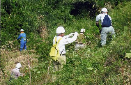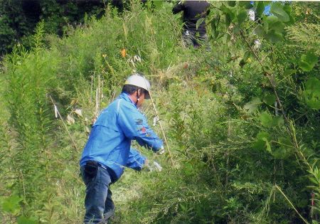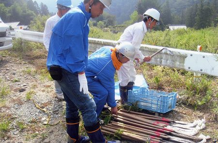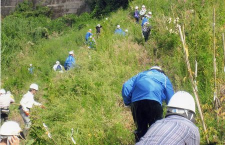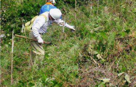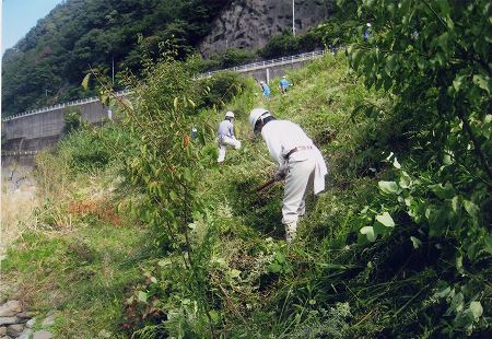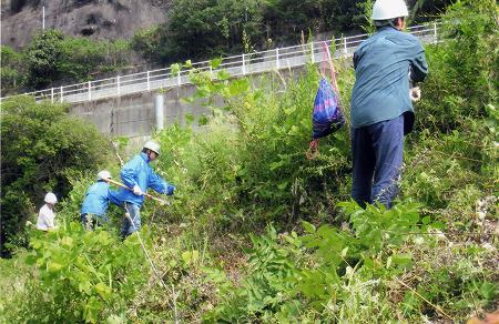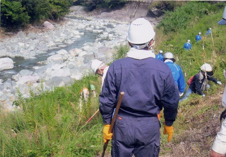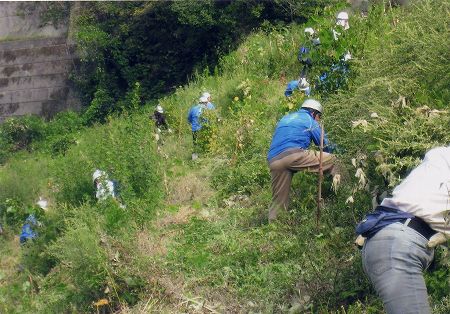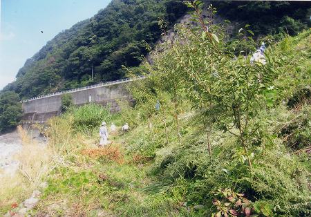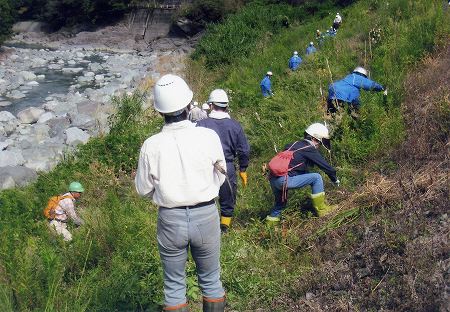 | 【活動内容】 当日は、アサヒビールと合同作業になりましたが、午前9時30分には、予定していた参加者が集合したので、上野代表の司会で開会行事をはじめました。 開会の挨拶でアサヒビール四国工場の波多野総務部長が「私共の会社と石鎚水源の森くらぶさんとの合同作業は、平成16年から今年で10年目を迎えております。私共の会社としても石鎚水源の森づくり事業がスムーズにできる様に何らかの支援をしたいと思っておりますので必要な要望があれば申し出てください。」と述べました。 続いて上野代表が「私共の石鎚水源の森くらぶが、発足以来ご参加をいただいている真鍋和年会員が、今年春の西条市の人事異動で「西条市副市長」に就任されておられますので、一言ご豊富のお言葉をいただきたく思います。」と述べました。 これに対して真鍋副市長は、「私はくらぶの会員番号4番ですが、入会した当時は、西条市の森林林業の担当の産業経済部長をしている時でした。入会した動機は、西条市は水の都ですが、その水を貯える森林が荒廃しつつあることを憂い、水源の森くらぶに参加し、現在にいたっております。今後とも、西条市の水源地を守るために皆さんと一緒に頑張りたいと思います。」と述べました。 開会行事が終わって、徒歩で500m程移動をして、加茂川沿いの堤防に植えてある山桜・梅3年~5年生の草刈作業を昼まで行いました。 作業終了後、集合場所に帰って昼食をして現地解散をしましたが、作業終了後雨が雨が降り出しました。当日は、暑い中での作業ご苦労さまでした。 (第209回石鎚水源の森づくり事業) 平成25年10月5日(土)9時30分から25名の参加者で加茂川水源の森2で実施することにしていましたが、雨天のため中止になりました。 |