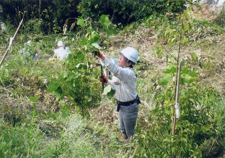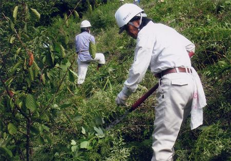 | 【事業実施内容】山桜・梅3年生~5年生、55アールの雑草木刈払い作業 |