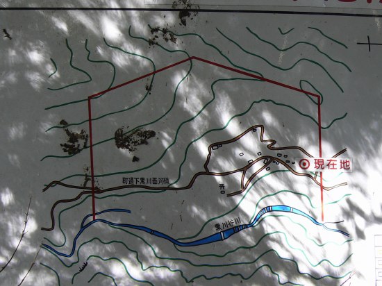 この建物の手前の虎杖橋のとろこに「黒川道」という登り口がありました。