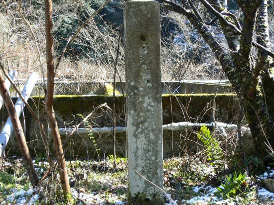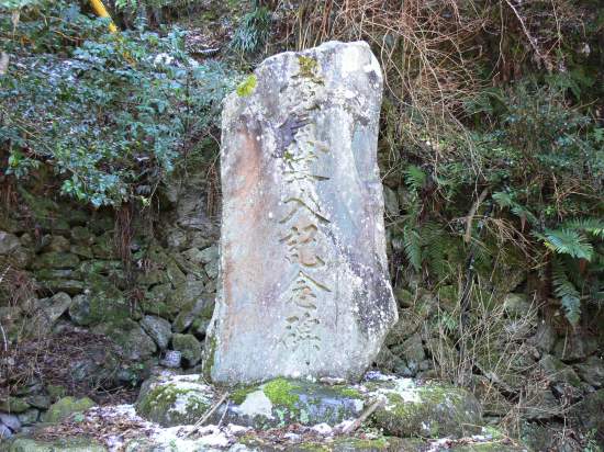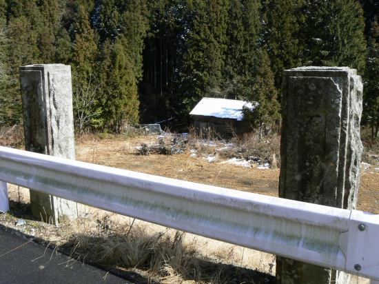 5分もたたないうちに、道が広くなっているところがありガードレールの向こう側に石柱が2本建っているのを発見。