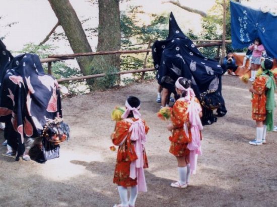 橋を渡って神社の境内に向かうと・・あったあった、この広場で獅子舞を行っていました・・。