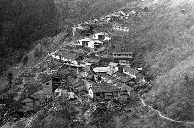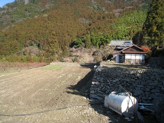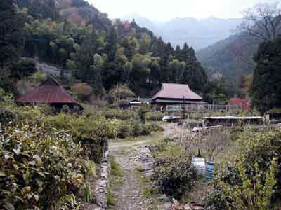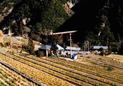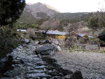 中之池集落の上部にある集落です。車道は集落の上側にあり、集落の中は徒歩で上り下りしなければなりません。斜面に民家が点在しています。ここからは大樽の滝が正面に見えます。 |