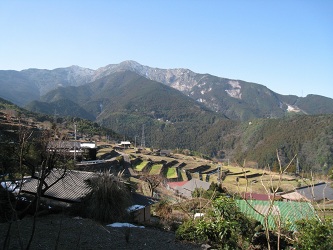 地名の起こりは、山の傾斜地に開墾された田畑が千町(せんちょう=約1000ヘクタール) もあろうかと思われるほど広いところから名付けられたと言われています。 標高150mから500mの間にみごとな棚田の石垣が広がっています。 山腹のいたるところに湧水があり、その水を利用して昔から稲作がおこなわれてきました。戦国時代、土佐から山を越えてこの地に土着した伊東氏により開発されたと伝えられています。 先人が苦労して、60haの広さで2,500枚以上を開拓した石積みの棚田でしたが、昭和40年代からの過疎化、高齢化により耕作放棄地が目立つようになり、今ではかつての景観は見られなくなってしまいました。 集落の背後には、櫛ケ峰(1112m)がどっしりとそびえており、千町地区のシンボルとなっています。 |