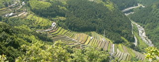 李の奥にあった集落です。昭和23年の地図を見ると、標高で400mを超えた山中に、5軒程度の民家が点在しています。山奥にもかかわらず、たくさんの石積みの耕作地があり、昔はずいぶん開けていたようです。李から菖蒲集落へ向かう道は、今ではほとんど人が通らないからか、草木が生い茂り、木々が倒れかかっているところもあり、時代の流れを感じます。菖蒲集落跡に着くと棚田・畑の跡、神社跡、集落跡などが残っています。 建物は既に取り壊されていて、どこに家屋敷があったのかわかりにくくなっていますが、そこには人々が生活していた痕跡がたくさん残っています。 かつての集落も、今では木々に覆われ、すべてが山林となっているため、集落跡に行かないと、どこに集落があったのかわからない状況になっています。集落跡からは、千町の棚田を真横から望むことができます。 |