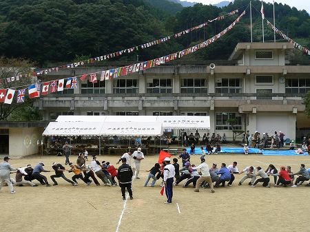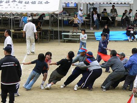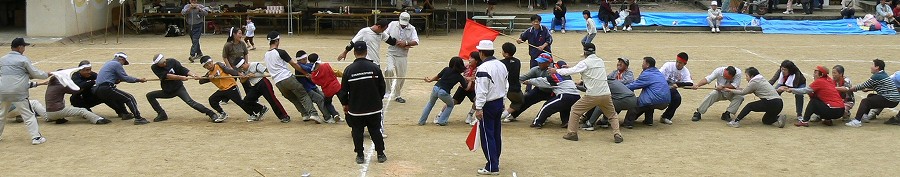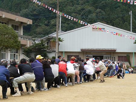 最後の競技、恒例の「綱引き」でしめくくりましょう。赤、白に分かれてオーエス。オーエス。 |