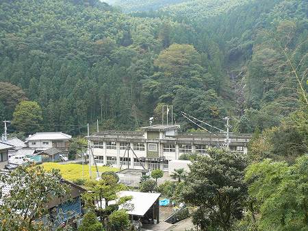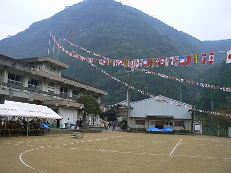 | 午後の競技が終了。加茂公民館(元加茂小学校)の遠景。お山の紅葉はまだまだこれから。しかし、だいぶ天気がよくなってきた。 |