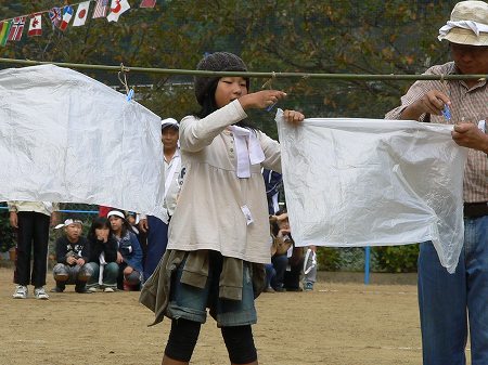 | さて次は、今年から新たに始めた「今日はせんたく日和」という競技。でも、今日はせんたく日和じゃないよね〜。 |