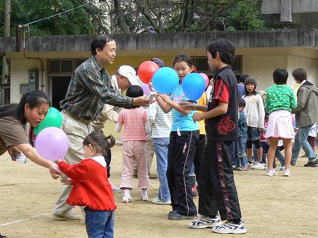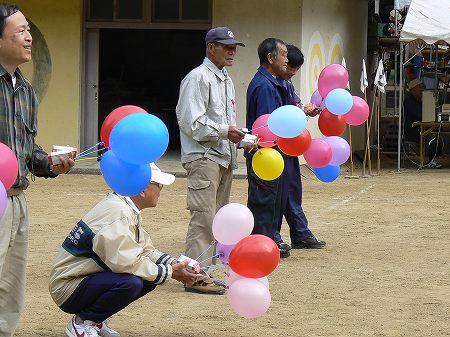 | 続いて「ふうせん拾い」・・幼児とあるが、小学生までが対象となった。やさしいおじさんたちが風船を持って待ってます・・^^; |