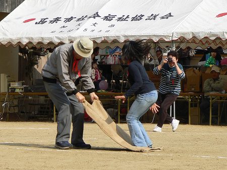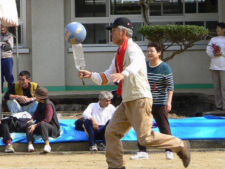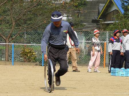 | 午前中最後の競技は、「加茂ふれあい5種リレー」 まずは、ランランリング。昔取った杵柄。うまい、うまい。 |