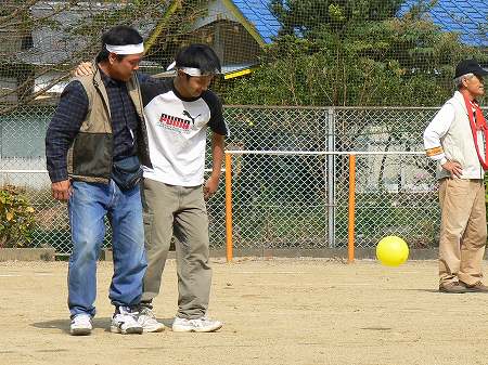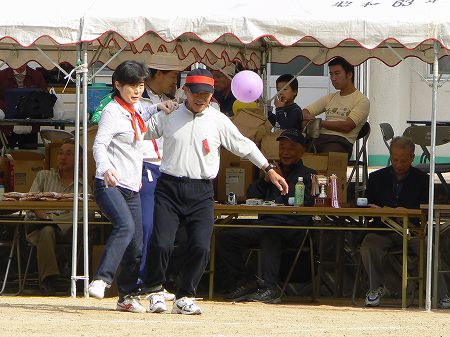 | 3種目目は、2人3脚ふうせん蹴り。こちらも、なかかな思うように進みません。風船を追いかけるのが、また大変。 |