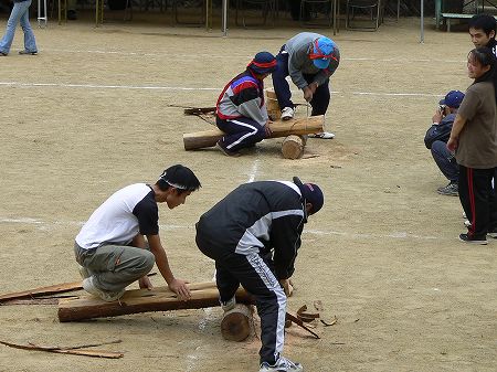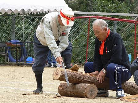 | 加茂の運動会名物「丸太切り競争」 このおじさん格好からしてプロみたい。(実はプロでした・・) |
