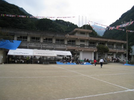 | 運動会の準備が整った加茂公民館。元加茂小学校、学校がなくなってもう14年になる。年月のたつのは早いものだ。 |