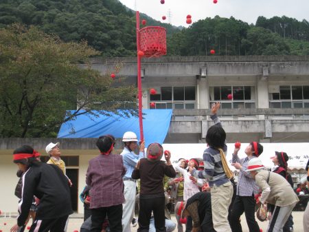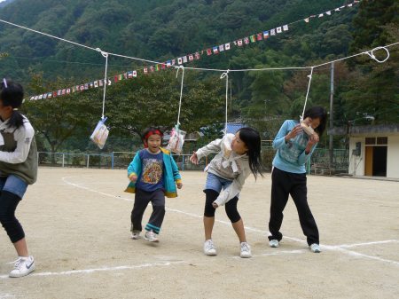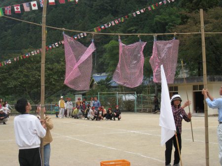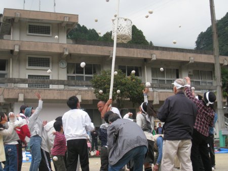 おなじみの「玉入れ」。みんな頑張っているがなかなか玉が入らない。籠を持っていると玉が頭にあたって痛い、痛い・・。 |