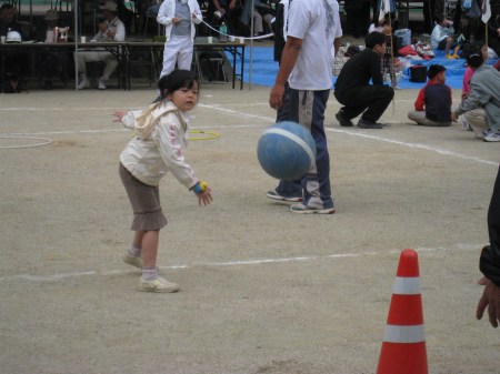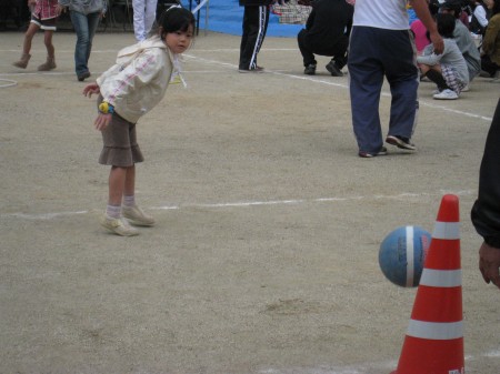 「おさんぽシュート」という競技。フラフープでボールを引っ張ってきて、投げてコーンを倒す。なかなかいいフォーム。さてどうなるか・・。 |