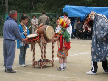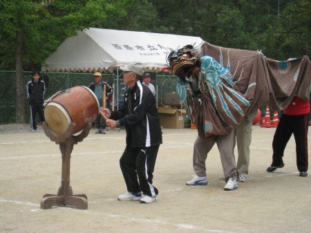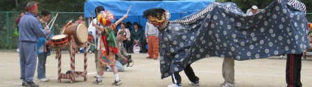 午前中の競技が終り郷土芸能の披露がはじまった。今年も加茂・大保木地区の獅子舞の競演。まずは大保木地区の「黒瀬の獅子舞」 |