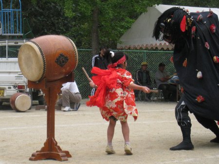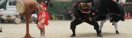 | 続いて大保木の「東宮神社の獅子舞」今年は久しぶりに子どもの「なぶりこ」が登場した。アライグマさんちの3姉妹、頑張ってるね。 |