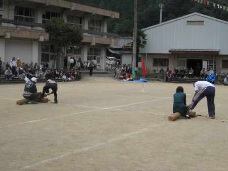 | 午後の競技が始まった。恒例の「丸太切り競争」。この競技はいつもみんなが熱くなる。今年も最後に大逆転劇があった。 |