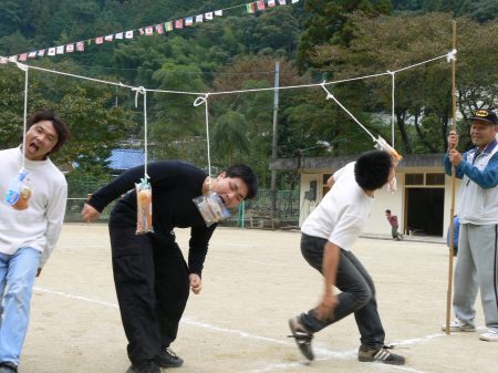 子どもたちの一番のお気に入り「パン食い競争」。あっ、右端の人、手を使ってはだめですよ〜。 |