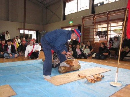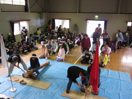 会場を体育館に移して、恒例の「丸太切り競争」 |
