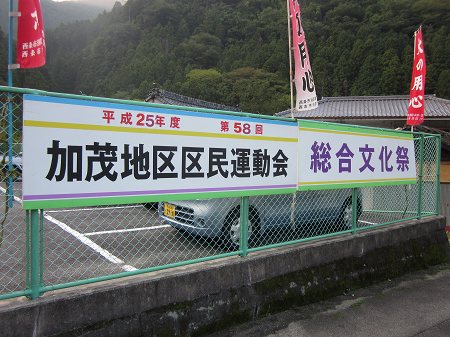 | 加茂公民館の駐車場にある開催看板。今年で第58回目の総合文化祭・運動会となる。 |