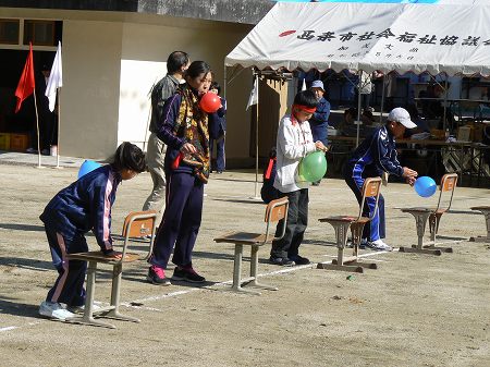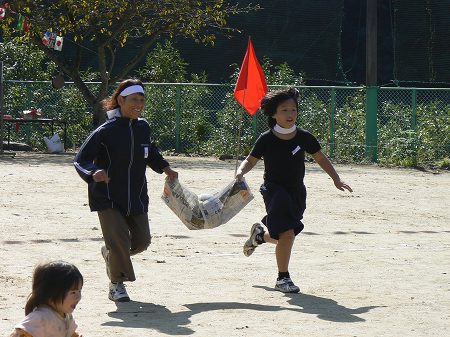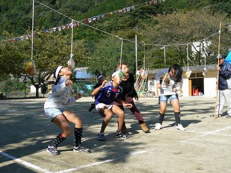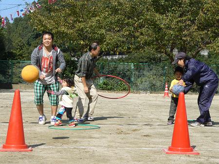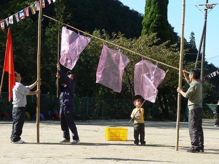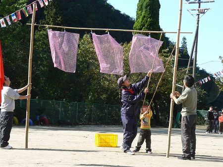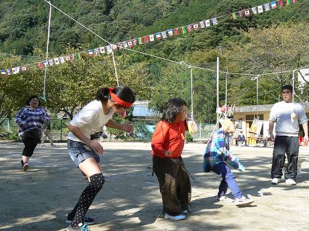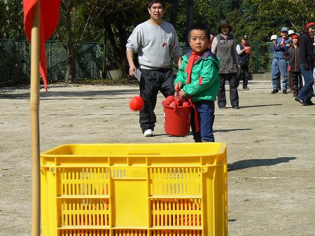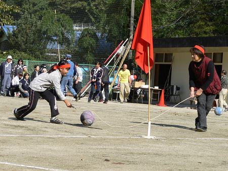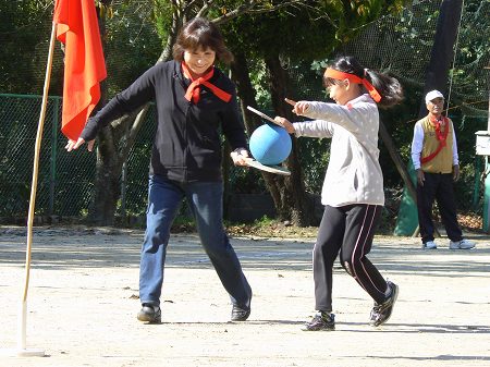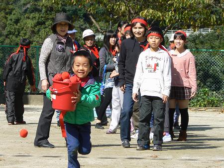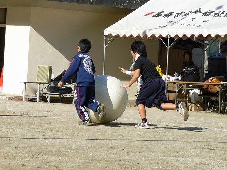 まずは、「大魚トロール船」という競技。なわとびの縄でボールを運ぶ競技だ。ボールが重く、なかなか前に進まない。 |