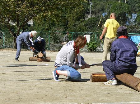 | 午後の競技が始まった。まずは、加茂の運動会名物「丸太切り競争」 |