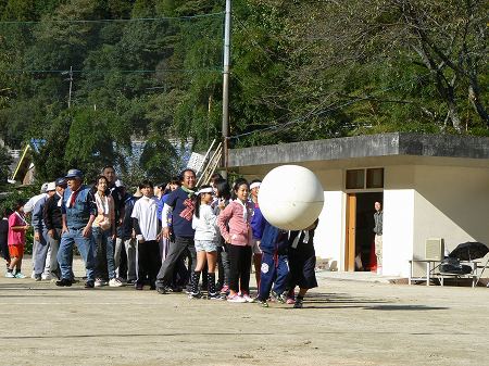 最後の競技は「おどる大玉はこび」頭の上で大玉をリレーして・・ |