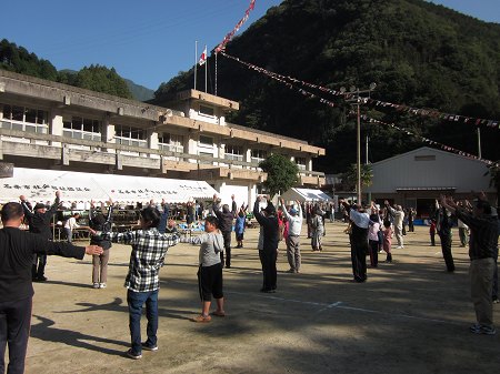 | 太陽が西の山に沈むころ、ラジオ体操で終了。 |