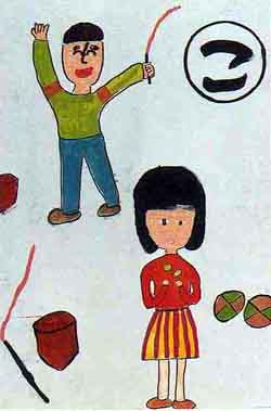 昔の遊び 昭和54年、心を豊かにする公民館活動で、生活文化をとりあげ、 昔の遊具づくりを実施しました。 カルタづくりもこの事業の一貫です。 この日は、お年寄りから男の子は「こま(ぶちごま)」、 女の子は「お手玉」をおそわり、作って遊びました。 ふちごまは、桜の木4〜5pのものを石垣の穴にさしこみ、 円錐状に削り、6〜7pで切りました。 みつまた、こうぞの皮を、木切れに結びつけ、このぶちで 叩いてこまをまわしました。 お手玉は、4×7pの布を4枚用意して縫い合わせ、中に 小豆、ハトムギ、エビスグサ等を入れつくりました。 |