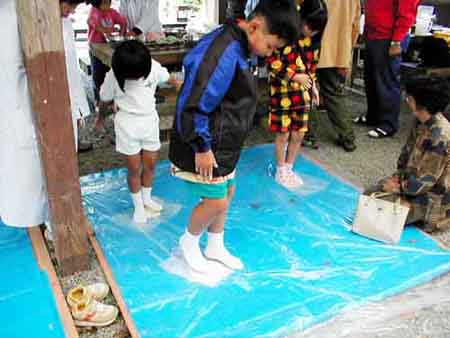 子供たちが足で一生懸命、うどを踏んでこねています。