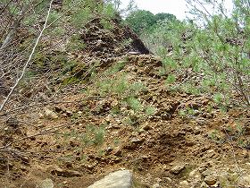 旧寒風山トンネル付近からみおろすと、当時を偲ぶことが出来る大きなズリ跡を確認することができます。