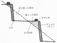 山腹斜面に田んぼを開くには、山手側は斜面を削り取りその時に出た石を反対側に積み上げて(積み上げる角度は山手側に約15°傾ける)平らな部分を作り出します。山の傾斜が緩やかなところは、石を少し積み上げるだけで奥行きの広い田んぼができます。山腹斜面の傾斜角度が30°を越える傾斜が急なところになると、『ギシ(石垣)』の高さが3メートルくらいあっても田んぼの奥行きが1.5メートルほどしかないところもあります。1枚の田んぼの広さは、1反(1000u)ほどの広いものから1畝(100u)ほどのものがあったりと様々です。