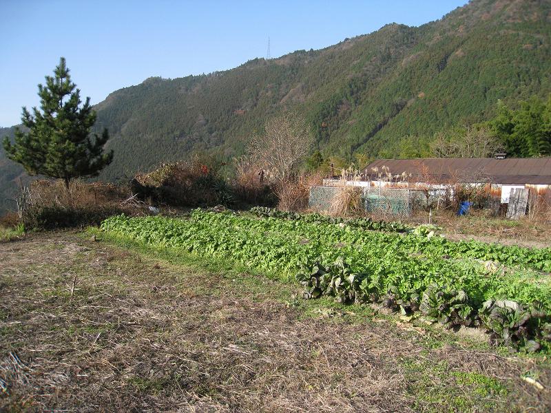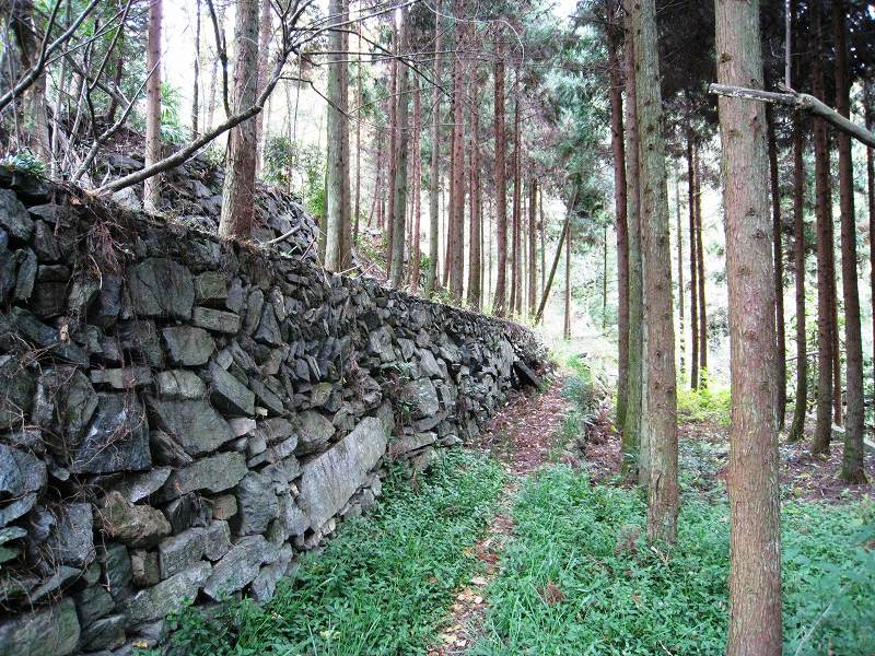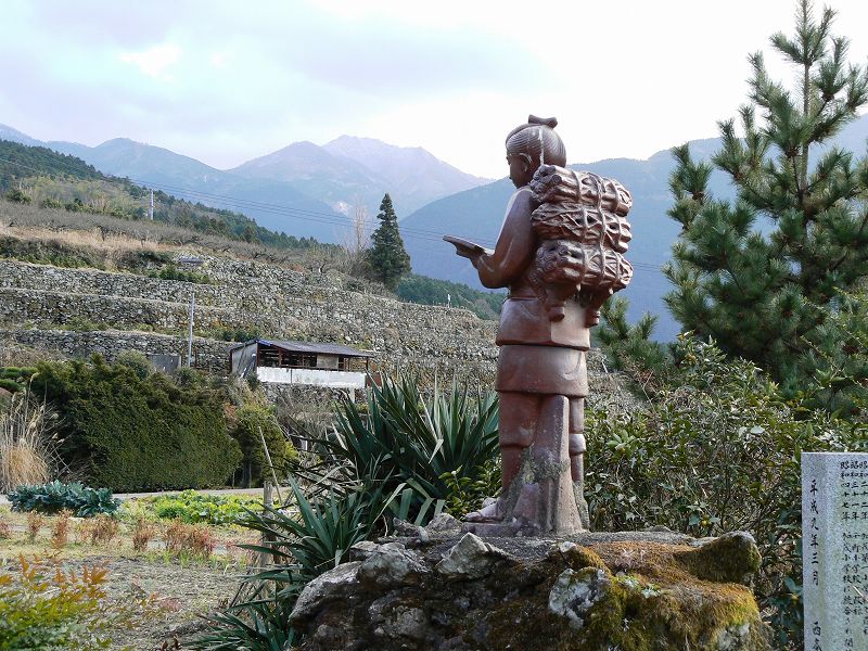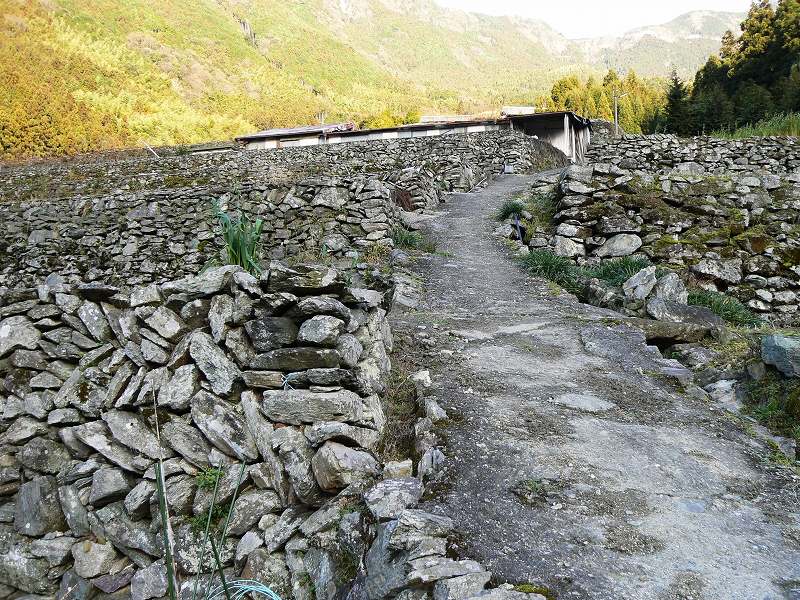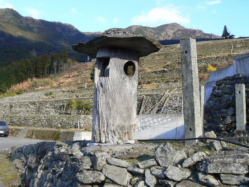 千町御代地集落にある木製の灯籠(後方は櫛ヶ峰)