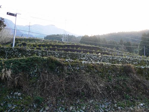 国道の千町バス停付近から見上げた棚田の石垣