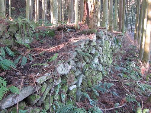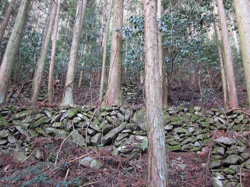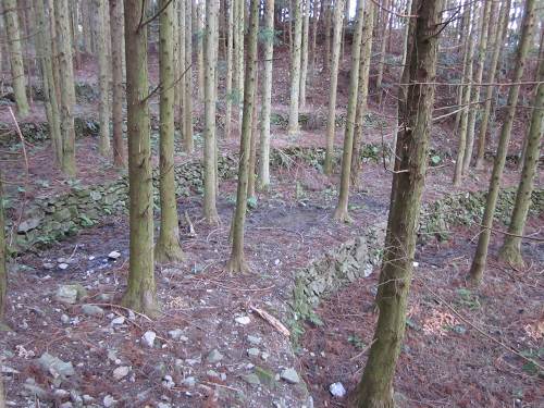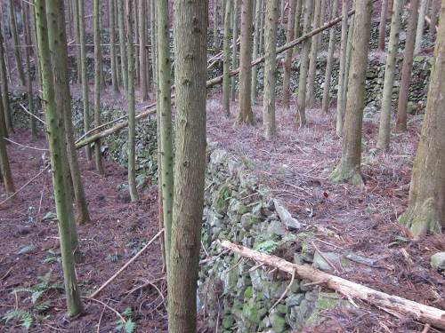 ![]() 李集落から歩道をしばらく登ると山中にたくさんの石垣が見えてくる |