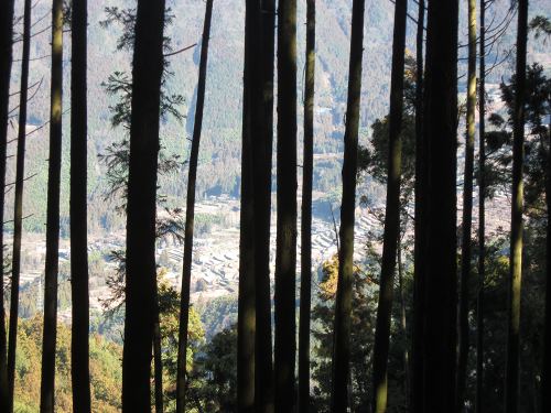 ![]() 集落跡からは、木々の間から千町集落が見える |