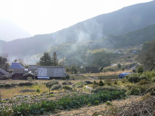| 千町集落の夕日 | 千町集落の木製の灯篭 |