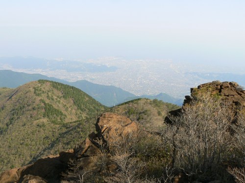 | 笹ヶ峰〜黒森山の山並み(かぶと岩から撮影) | かぶと岩と新居浜市街地(西赤石山から撮影) |