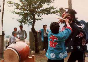 獅子頭2人、太鼓1人、時には小太鼓がはいり、合計3〜4人で獅子舞をつとめます。