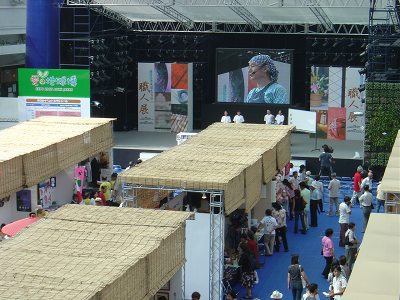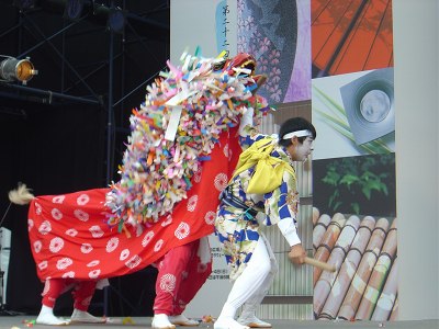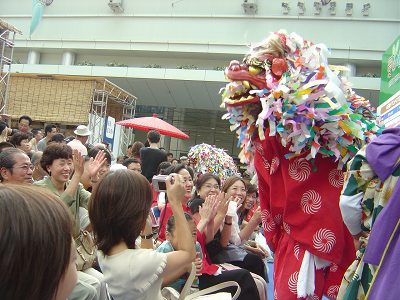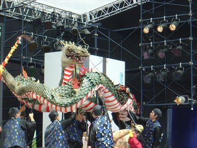 | 午前11時前オアシス21の銀河の広場に到着した。地下鉄の栄駅からすぐの場所にあった。 | 舞台では長崎の龍踊りが舞われていた。こちらもなかなか迫力があった。 | |