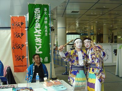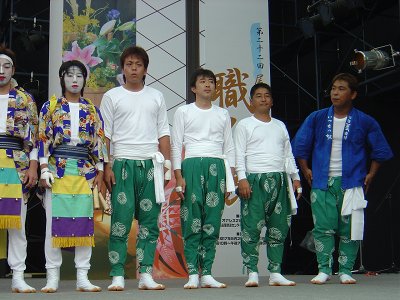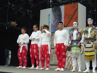 | 崎戸のコーナーを見つけた。これから獅子舞を演じる「さざんか会」の方に会った。記念写真をお願いすると、こころよくポーズをしてくれた。 | 午後1時いよいよ獅子舞が始まる。舞台上に整列した崎戸の「さざんか会」の皆さん。 | |