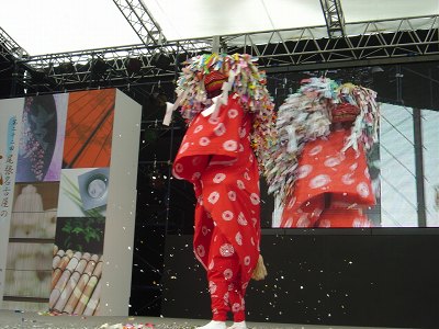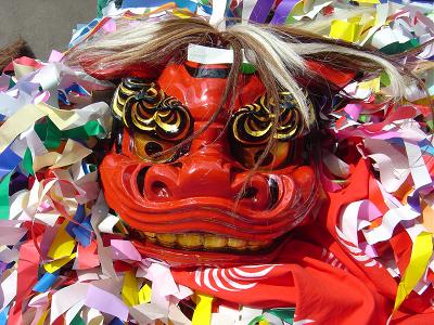 | 2曲目に入る。獅子の舞い方が変わってきた。これは昭和40年代にアレンジしたもので獅子舞実演の新曲ということだった。 | 後ろ足の使い手が前足の使い手を肩車して紙吹雪をまくシーン。場内からは驚きの声と大きな拍手がおこった。 | |