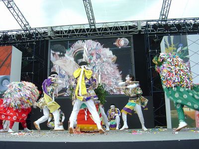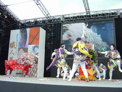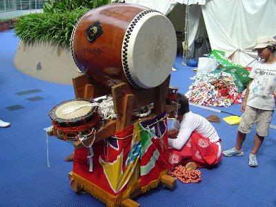 | 大太鼓と締太鼓。移動しやすいように車がついている。 | オアシス21の銀河の広場の会場 | |