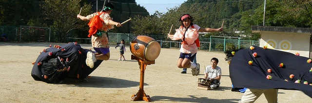 ☆昭和40年代この頃は、山間部の過疎化による後継者不足で、存続が危ぶまれた時期でした。「なぶりこ」のなり手がなく、青年団がつとめていた時期もありました。 昭和49年に加茂地区公民館が中心となり、「なぶりこ」の育成を行いました。 獅子頭、太鼓、衣装を新調し、再出発しました。 このころから、化粧の風習がなくなり、トレパンから短パンへと徐々に変わっていきました。 |