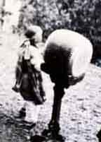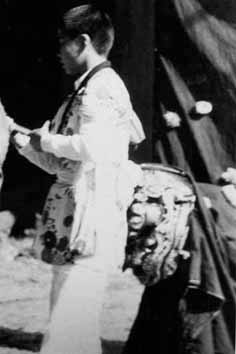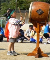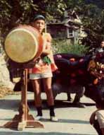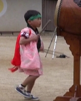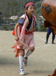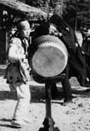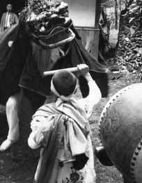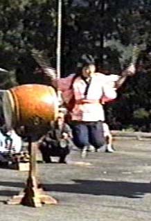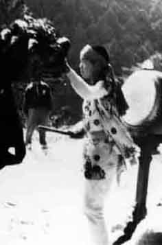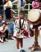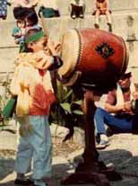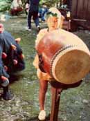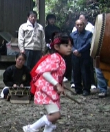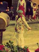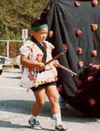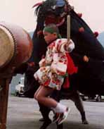 ☆昭和30年代獅子頭も太鼓も一世代前のものです。この頃の「なぶりこ」は、頭は 丸坊主で、化粧をし、トレパンをはき、背中には、たすきを何重にも結ん でいました。 練習はかなり厳しく、間違えると獅子で頭を殴られたり、足を払われたり して、泣き出す子供もいたようです。子供が多かったため、 「なぶりこ」ができる子供はごく一部で、 期間も3〜4年と短かったようです。 |
