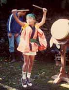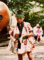 ☆昭和63年〜平成8年加茂小学校と協力して、「なぶりこ」の育成を積極的に行いました。それまでは、お祭りの際の「なぶりこ」は、2人だったのですが、 4人の「なぶりこ」が活躍した時期もありました。 人数が増えたので、衣装を追加し、ズボンもそれぞれが好みのものを はくようになりました。 |