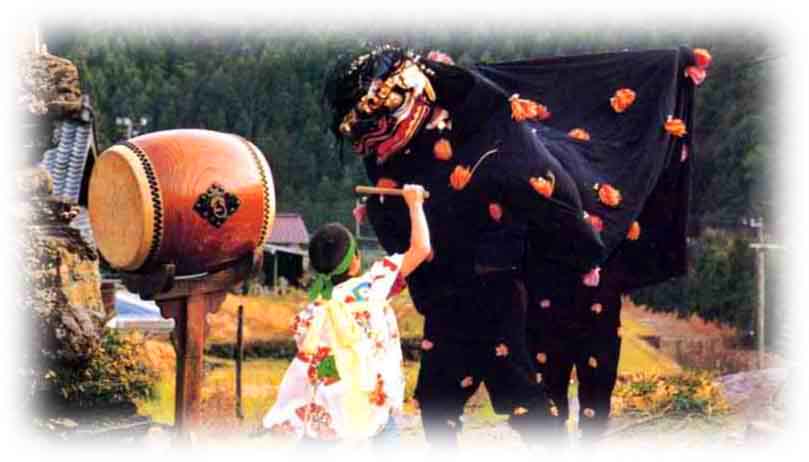 なぶりこ:獅子の様子を見ながら太鼓をたたく。