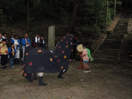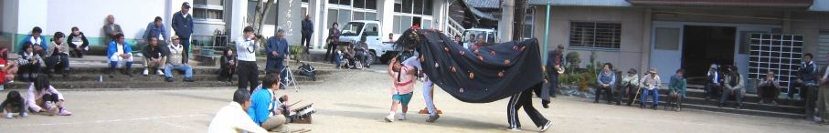 | 東宮神社前の民家の広場での獅子舞。 | 小学校3年生のT君のなぶりこの演技 |