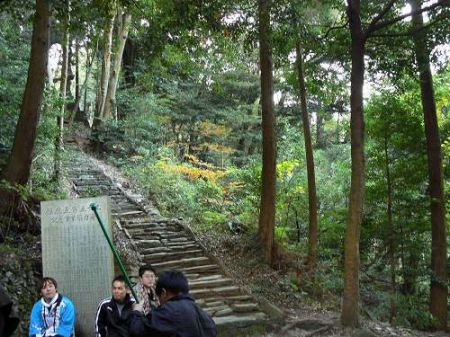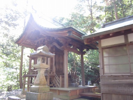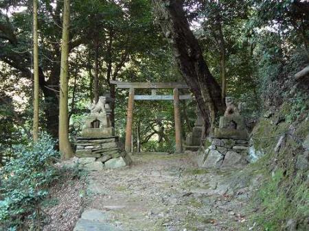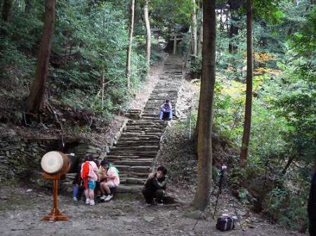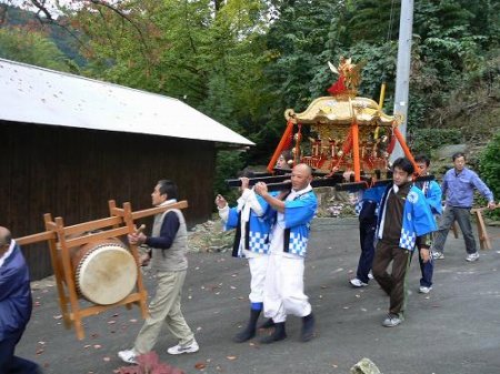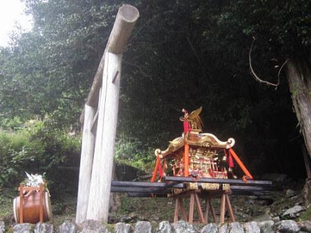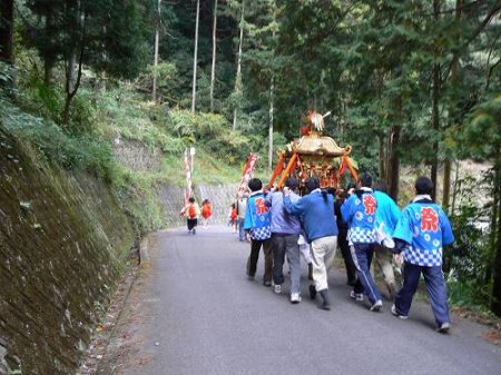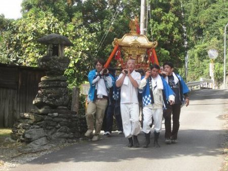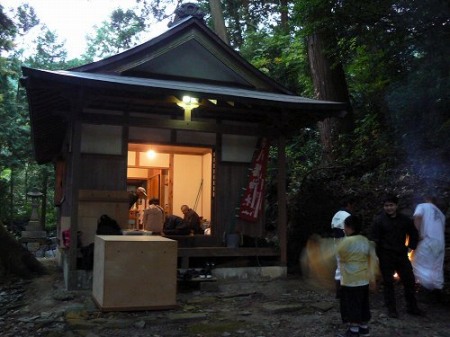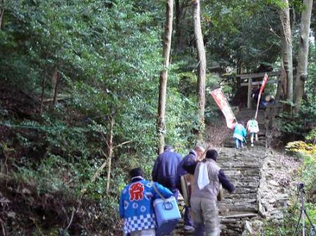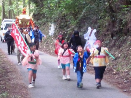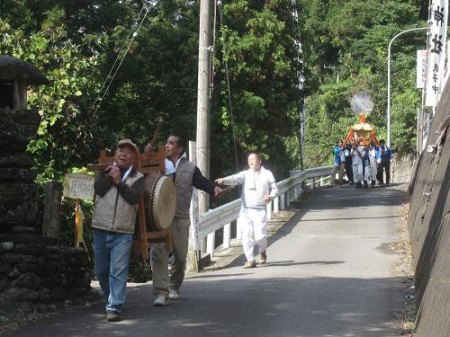 | 露払いを先頭に山中を下る。 | 30分ほどで東宮神社に到着 |